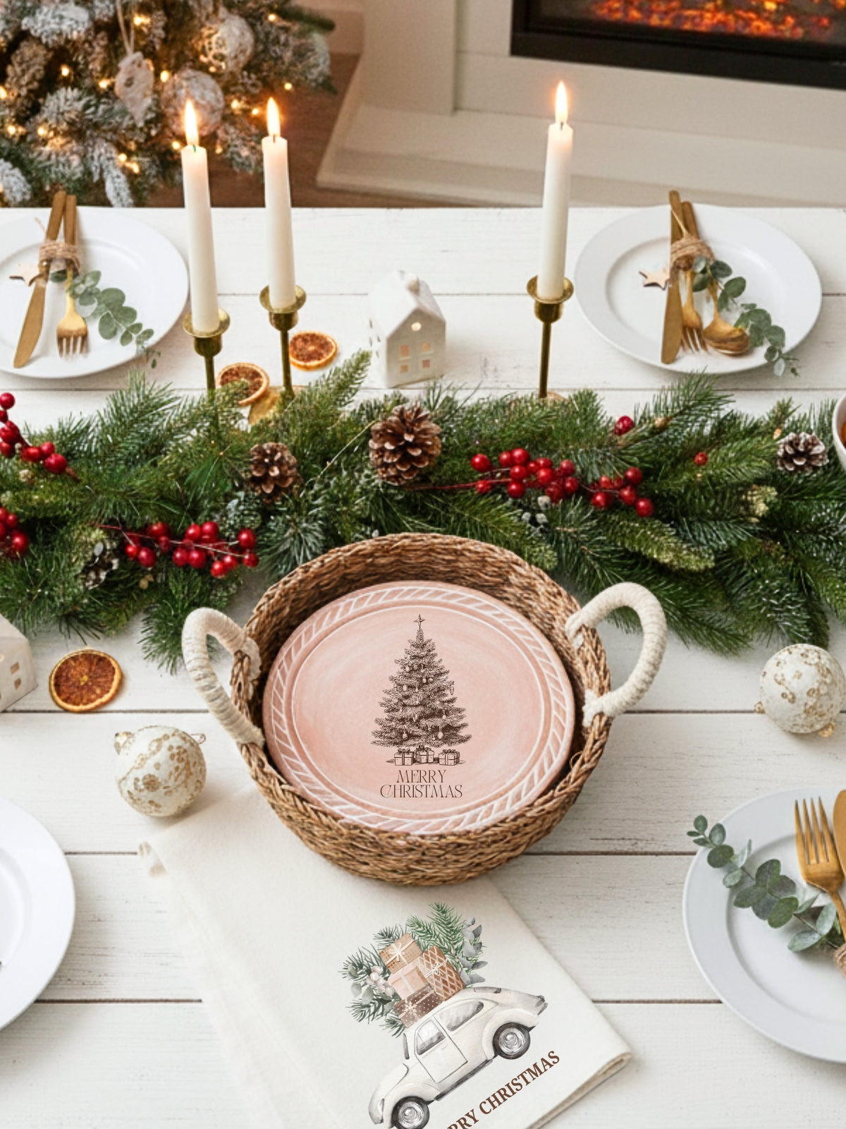 Bring the warmth of the season to your table with our charming Christmas Tree Bread Warmer & Woven Basket set and Tea Towel Set. This isn't just a kitchen accessory; it's a celebration of holiday gatherings, designed to keep your bread warm and your celebrations full of good cheer. The set features a terracotta warmer with a cheerful Christmas tree design, ready to be heated and placed inside the basket. The warmer fits snugly within a handwoven, sustainably sourced basket, creating a rustic and inviting display that perfectly complements your holiday decor.